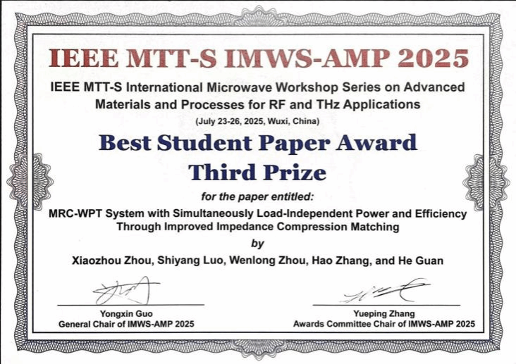 2025年7月23至26日,江苏省产业技术研究院和香港城市大学青岛研究院主办的国际微波系列研讨会(IEEE MTT-S International Microwave Workshop Series on Advanced Materials and Processes for RF and THz Applications)在江苏省无锡市成功召开。经过评审,会议最终评选出来自悉尼大学、上海交通大学、东南大学、电子科技大学和伟德bv1946官网的6篇会议论文当选最佳学生论文奖,其中一等奖1名、二等奖2名、三等奖3名,关于2023级硕士研究生周小舟凭借氮化镓高频磁谐振无线传能系统相关研究获得三等奖,指导教师为学院张浩副教授。