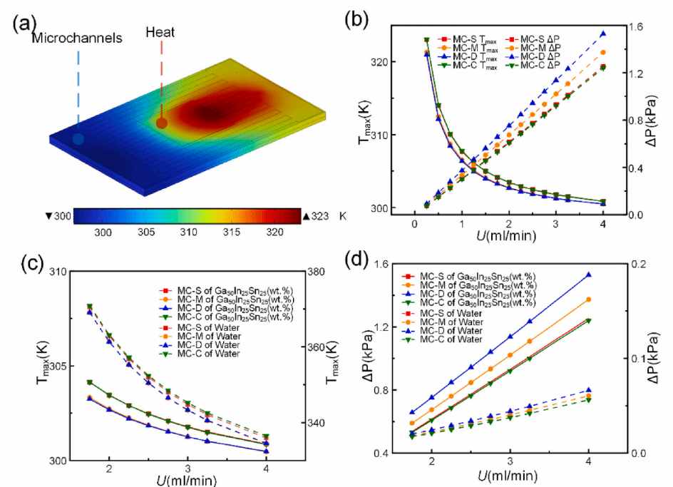 图2 不同微通道结构在不同流速下的温度等值线分布、热源最高温度与压降对比分析、液态金属与水在热源最高温度和压降上对比分析