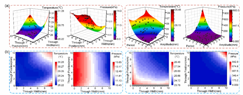 图3 温度与压降响应曲面拟合结果以及设计空间内热力与水力性能分布