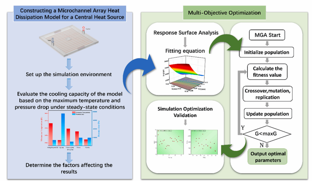 高热流密度是制约微型化高功率微电子系统性能与可靠性的关键因素。团队提出了一种基于液态金属(LM)的微流体冷却系统,通过数据驱动的计算框架优化改进的遗传算法(LC-GA),旨在为高密度集成系统提供高效的热管理解决方案。通过在硅基板上集成LM近端冷却与微通道散热技术,团队开发出一种异构三维互连冷却架构,能够通过算法引导的参数调优实现热性能优化。为验证该方法,我们设计、制备并实验测试了四种不同微通道结构。将LM引入通道后,对模拟热源进行了实验冷却测试和热性能仿真。实验结果表明,通过计算参数确定优化的LM微流体冷却系统,可有效散热功率高达800W的芯片,同时保持稳定热性能。此外,结合响应曲面法与改进的LC-GA进行多因素敏感性分析和多目标优化,实现了热阻与压降平衡的最优设计参数和运行参数的自动确定。优化后的配置将芯片最高温度降至约357.54K,降低了系统压力要求,并将性能评估标准(PEC)提升至2.327。本研究提出了一种数据驱动的优化方案,通过算法辅助的热设计支持高性能集成微系统开发。成果以“Liquid metal microfluidic cooling system for high-efficiency thermal management via learning-based genetic algorithm”发表于《ENGINEERING APPLICATIONS OF ARTIFICIAL INTELLIGENCE》。(1区TOP)